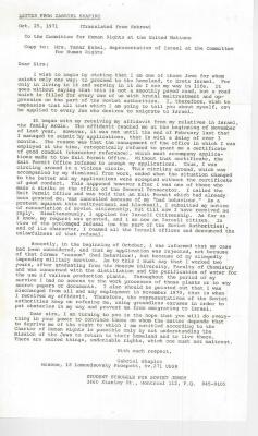 LETTER FROM GABRIEL SHAPIRO Oct. 25, 1971 (Translated from Hebrew) To the Committee for Human Rights at the United Nations Copy to: Mrs. Tamar Eshel, Representative of Israel at the Committee for Human Rights