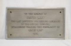Large plaque with inscription, "To the Memory of David May, The May Institute for Medical Research of the Jewish Hospital established through the generosity of Mary May, 1939"