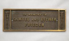 Small bronze plaque with the inscription, "In Memory of Samuel and Esther Frieder"